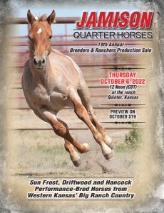 JAMISON Quarter Horses 19th Annual Breeders & Ranchers Production Sale Thursday, October 6, 2022 12 Noon (CDT) at the ranch Quinter, Kansas Sun Frost, Driftwood and Hancock Performance-Bred Horses from Western Kansas’ Big Ranch Country PREVIEW on October 5th