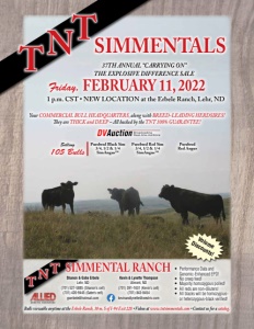 T SIMMENTALS N T T N T SIMMENTAL RANCH 37TH ANNUAL “CARRYING ON” THE EXPLOSIVE DIFFERENCE SALE Friday, FEBRUARY 11, 2022 1 p.m. CST • NEWLOCATION at the Erbele Ranch, Lehr, ND Your COMMERCIAL BULL HEADQUARTERS, along with BREED-LEADING HERDSIRES! They are THICK and DEEP – All backed by the TNT 100% GUARANTEE! Selling 105 Bulls Purebred Black Sim 3/4, 1/2 & 1/4 SimAngus™ Purebred Red Sim 3/4, 1/2 & 1/4 SimAngus™ Purebred Red Angus • Performance Data and Genomic-Enhanced EPD! • No creep feed! • Majority homozygous polled! • All reds are non-diluters! • All blacks will be homozygous- or heterozygous-black verified! Kevin & Lynette Thompson Almont, ND (701) 391-1631 (Kevin’s cell) (701) 843-8454 kevinandlynette@westriv.com Shanon & Gabe Erbele Lehr, ND (701) 527-5885 (Shanon’s cell) (701) 426-9445 (Gabe’s cell) gserbele@hotmail.com Bulls viewable anytime at the Erbele Ranch, 30 m. S of I-94 Exit 228 • Videos at www.tntsimmentals.com • Contact us for a catalog. Volume Discounts!